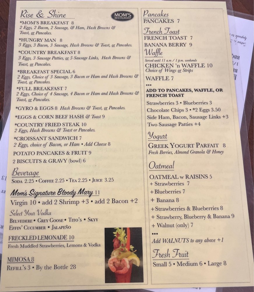 At Mom's Restaurant, we pride ourselves on crafting delicious meals that evoke the warmth of home cooking. Nestled in Trenton, MI, our establishment is a beloved gathering spot where patrons are treated like family. From breakfast classics like fluffy omelettes and crispy hash browns to hearty dinners featuring corned beef and cabbage, our diverse menu caters to all tastes. Customers appreciate our friendly service and the nostalgic ambiance that reflects a sense of community. With a focus on quality ingredients and generous portions, Mom's Restaurant is the perfect place to savor comforting food and create lasting memories.